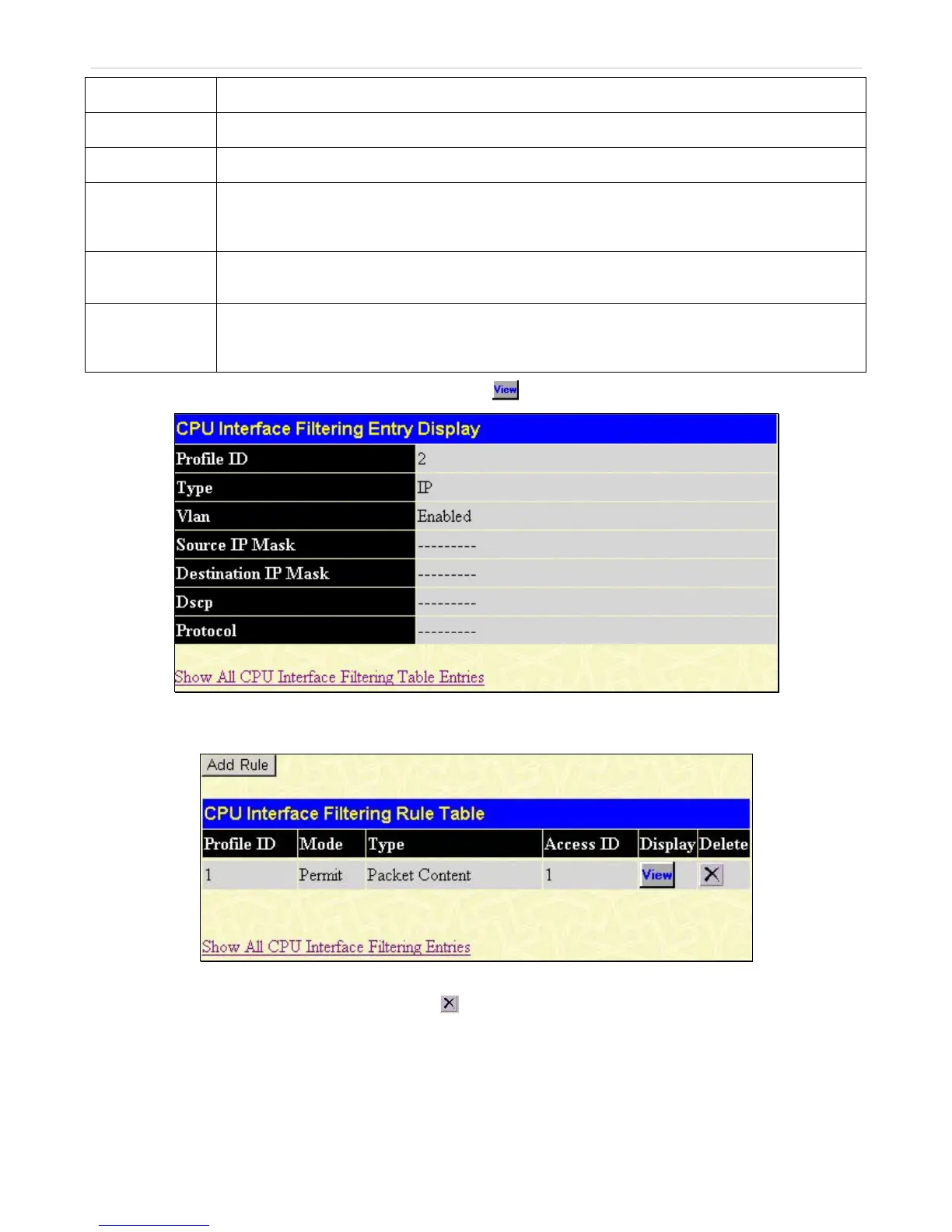 The following window is the CPU Interface Filtering Rule Table for Packet Content.