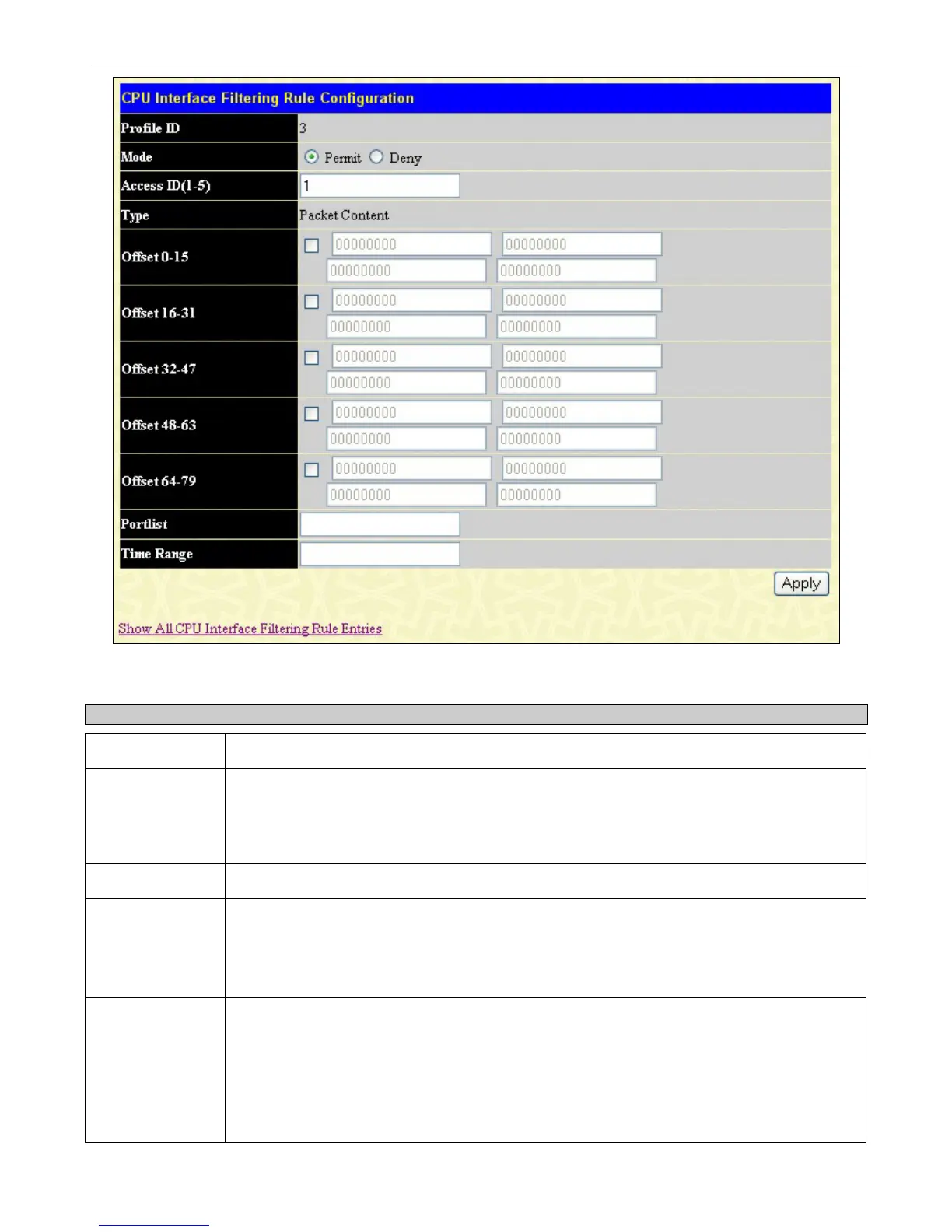 Figure 9- 28. CPU Interface Filtering Rule Configuration window - Packet Content Mask