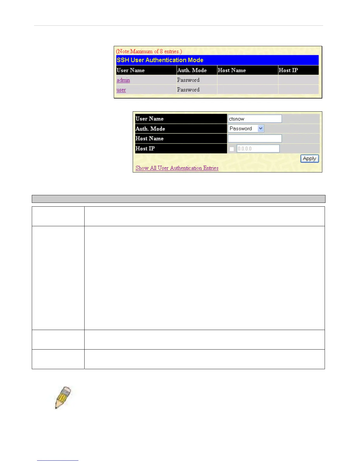 NOTE: To set the SSH User Authentication parameters on the Switch, a User Account