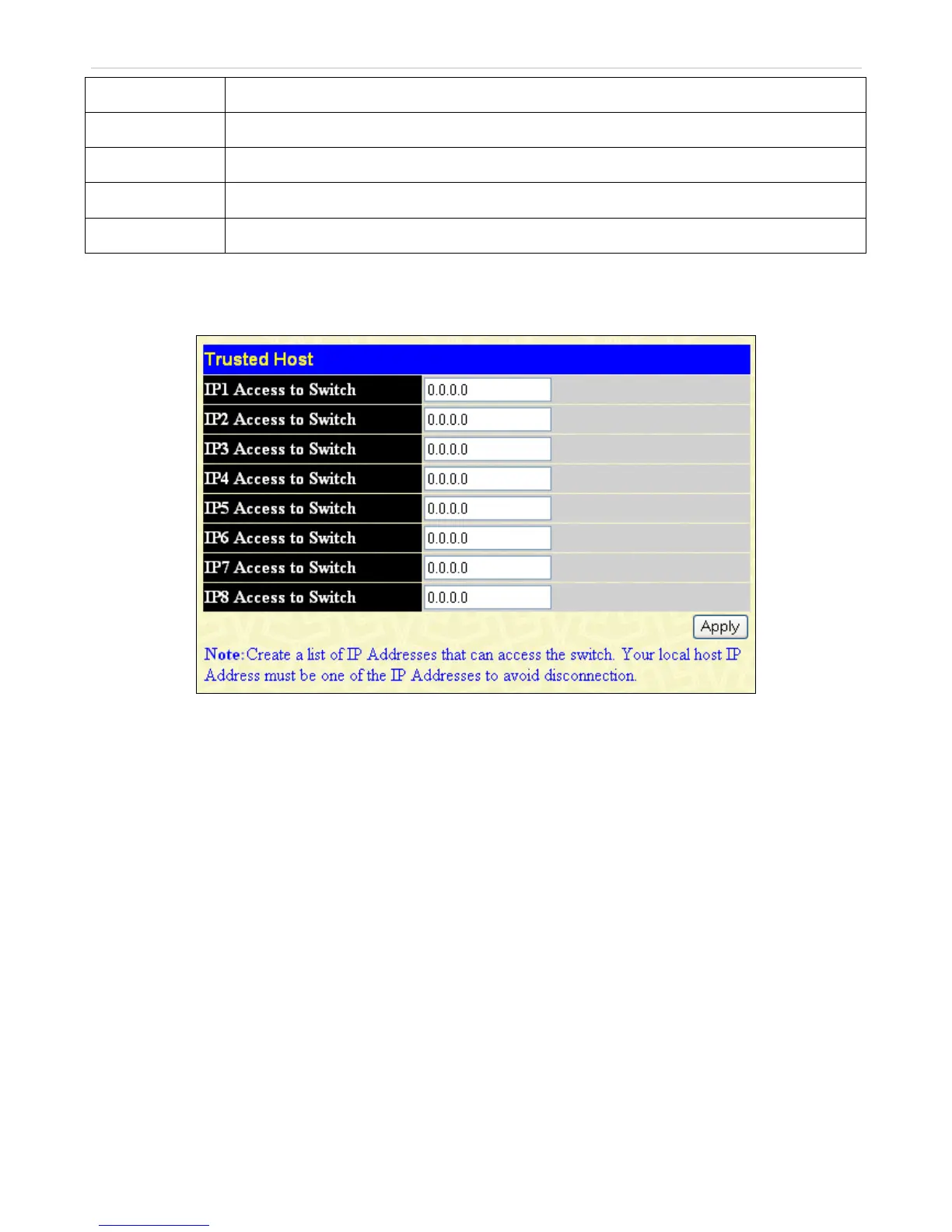 manager or Telnet session. To define a management station IP setting, type in the IP address and click the Apply button.