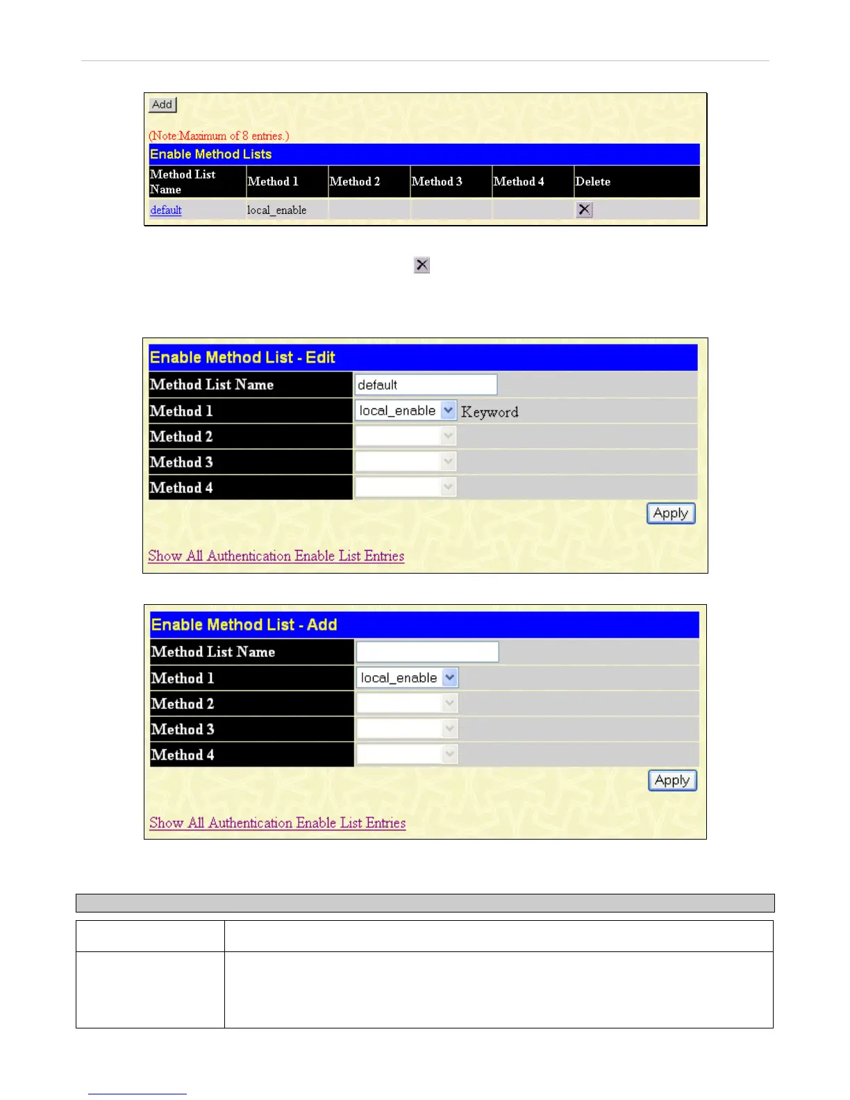 To view the following table, click Security > Access Authentication Control > Enable Method Lists: