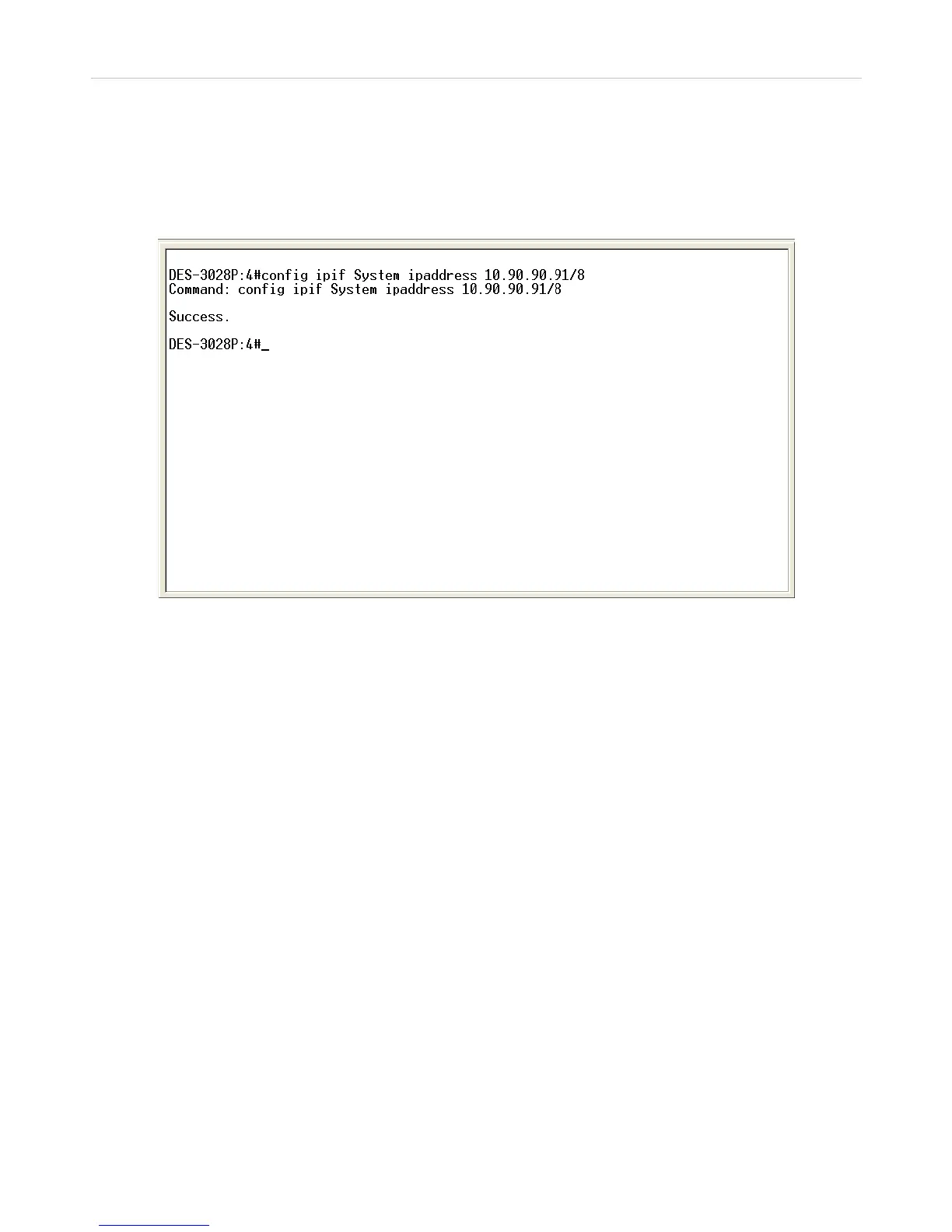 used to set the address (10.90.90.91/8). The system message Success indicates that the command was executed successfully. The