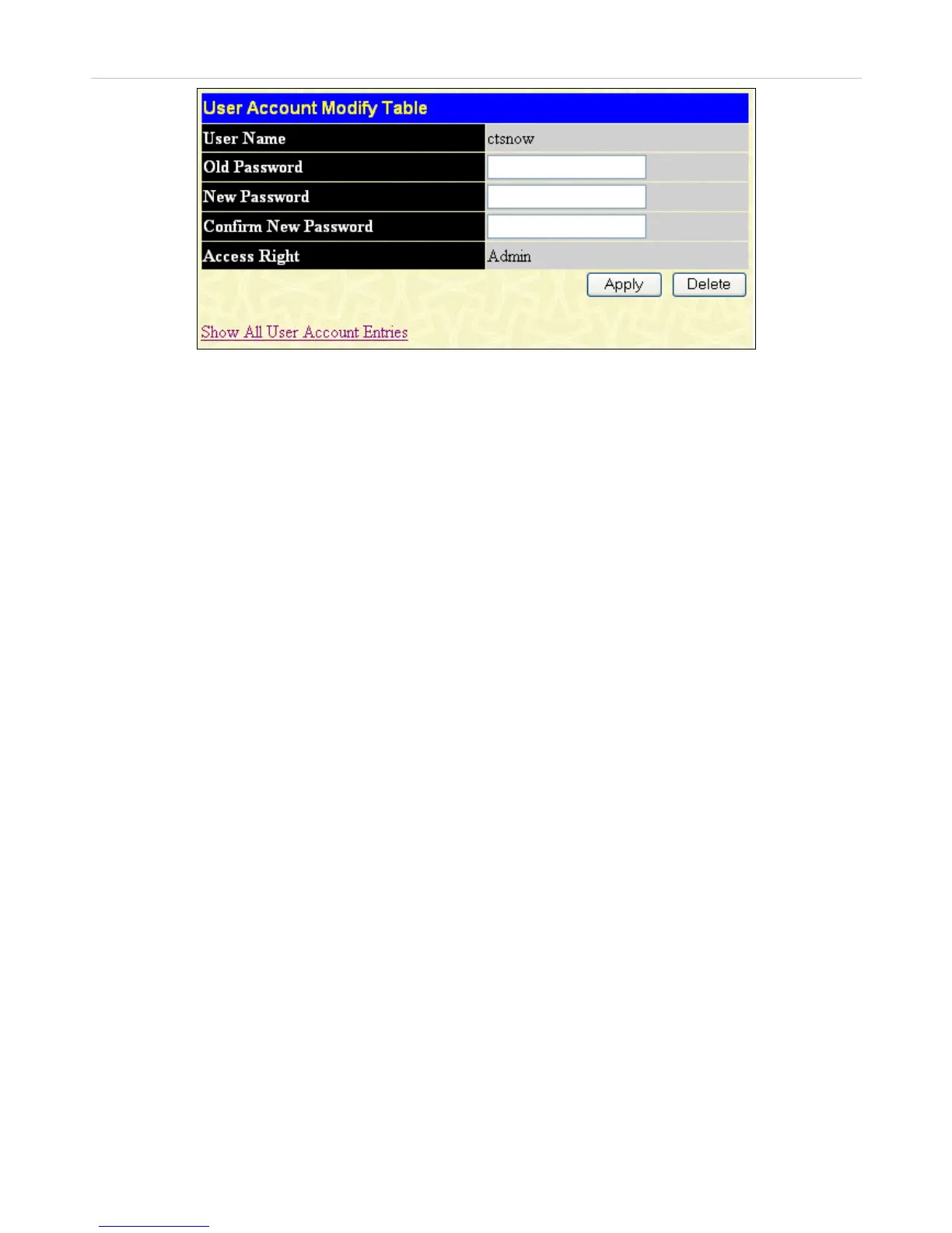 Modify or delete an existing user account in the User Account Modify Table. To delete the user account, click on the Delete