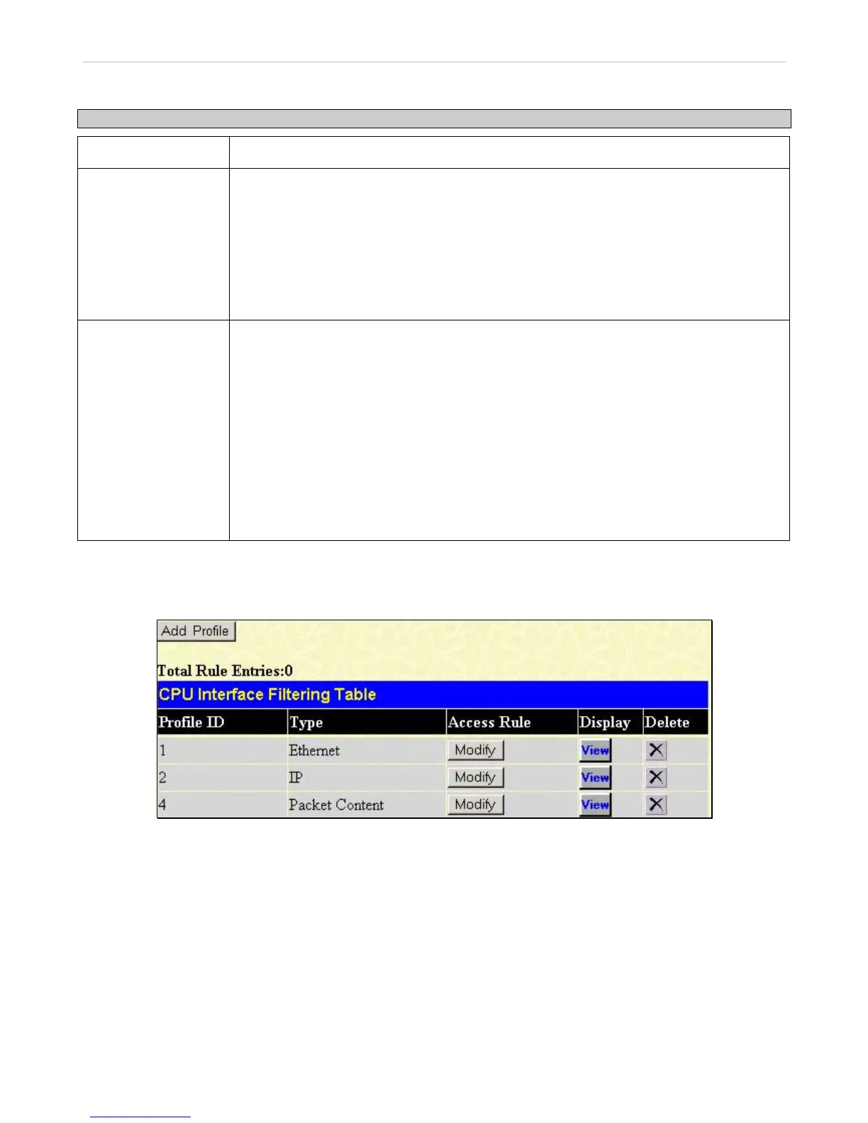 In the ACL folder, click CPU Interface Filtering to open the CPU Interface Filtering Profile Table window.