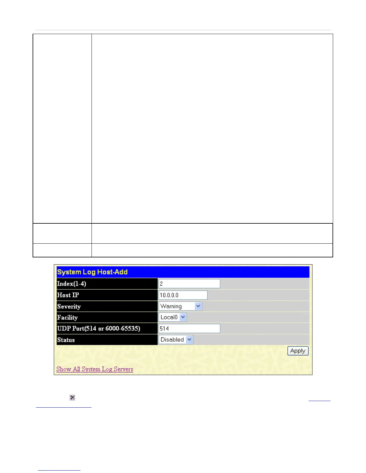 To set the System Log Server configuration, click Apply. To delete an entry from the System Log Host window, click the