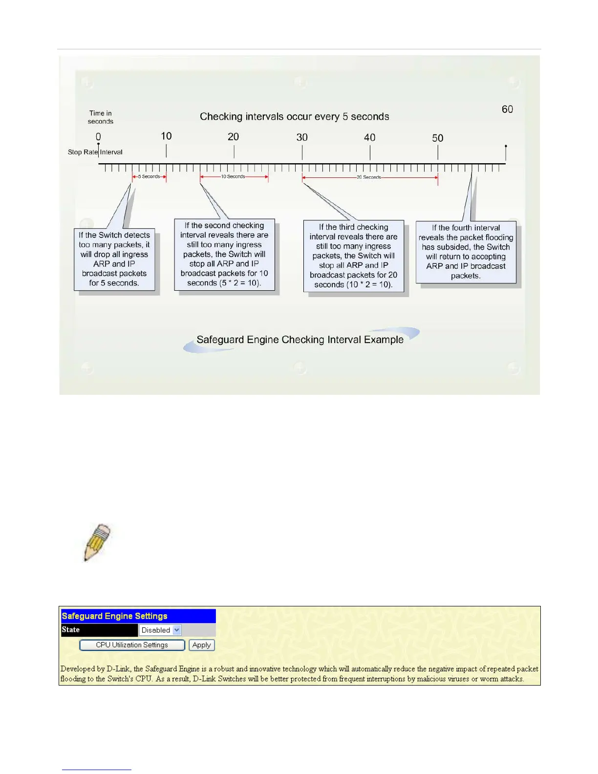 For every consecutive checking interval that reveals a packet flooding issue, the Switch will double the time it will discard ingress