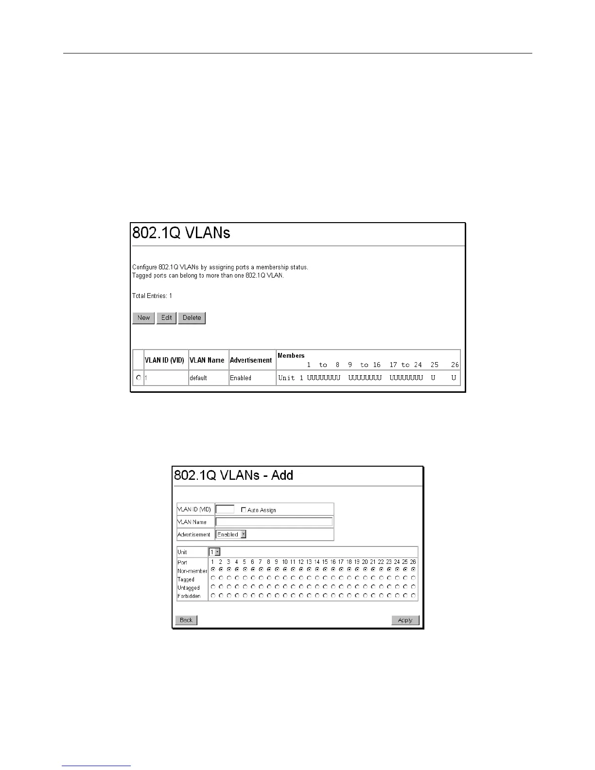 To delete an existing 802.1Q VLAN, click the corresponding click-box to the left of the VLAN you want to delete from the