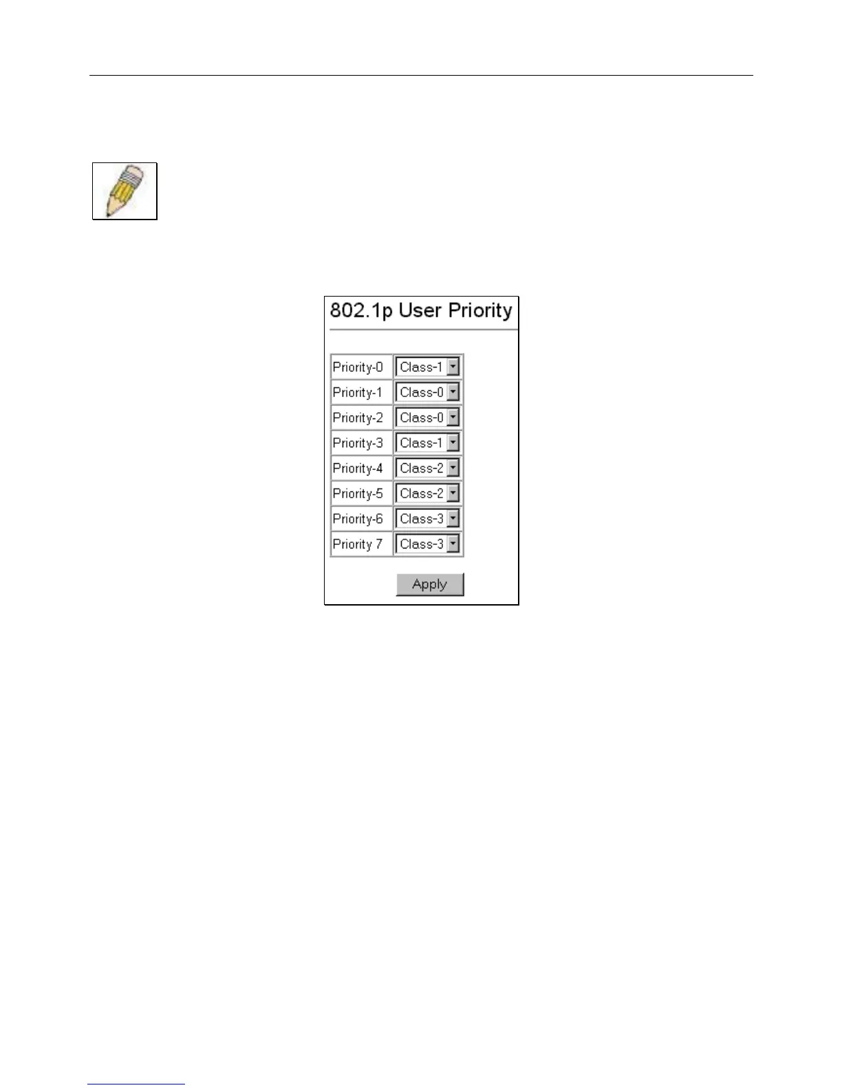 The DES-3226S allows the assignment of a User Priority to each of the 802.1p priorities.