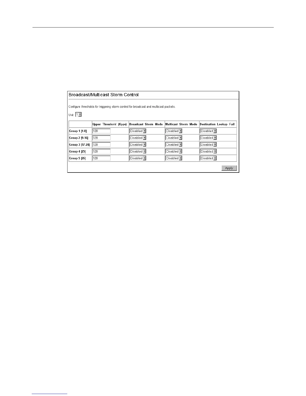 than specified in the Upper Threshold (Kpps) field, the Switch will drop all broadcast packets received by any port in the port