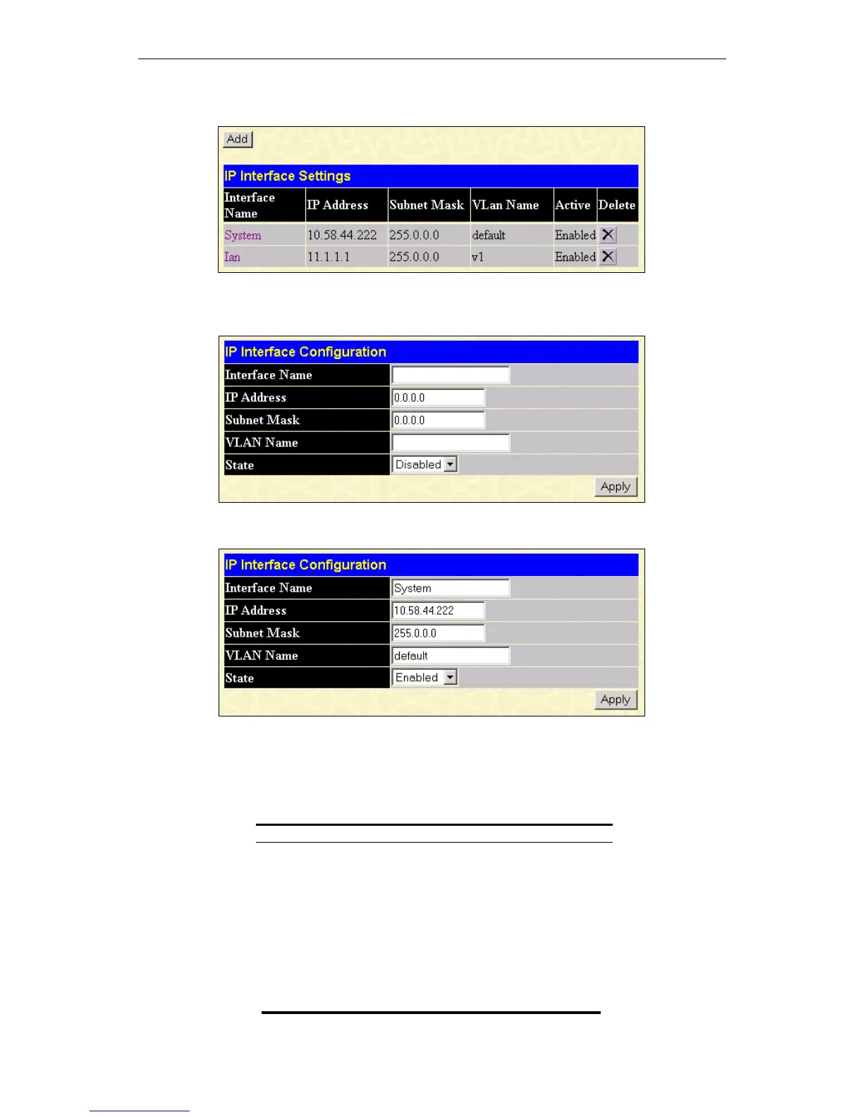 fields. Pull the State pull-down menu to Enabled and click Apply to enter to make the IP interface effective. Use the Save