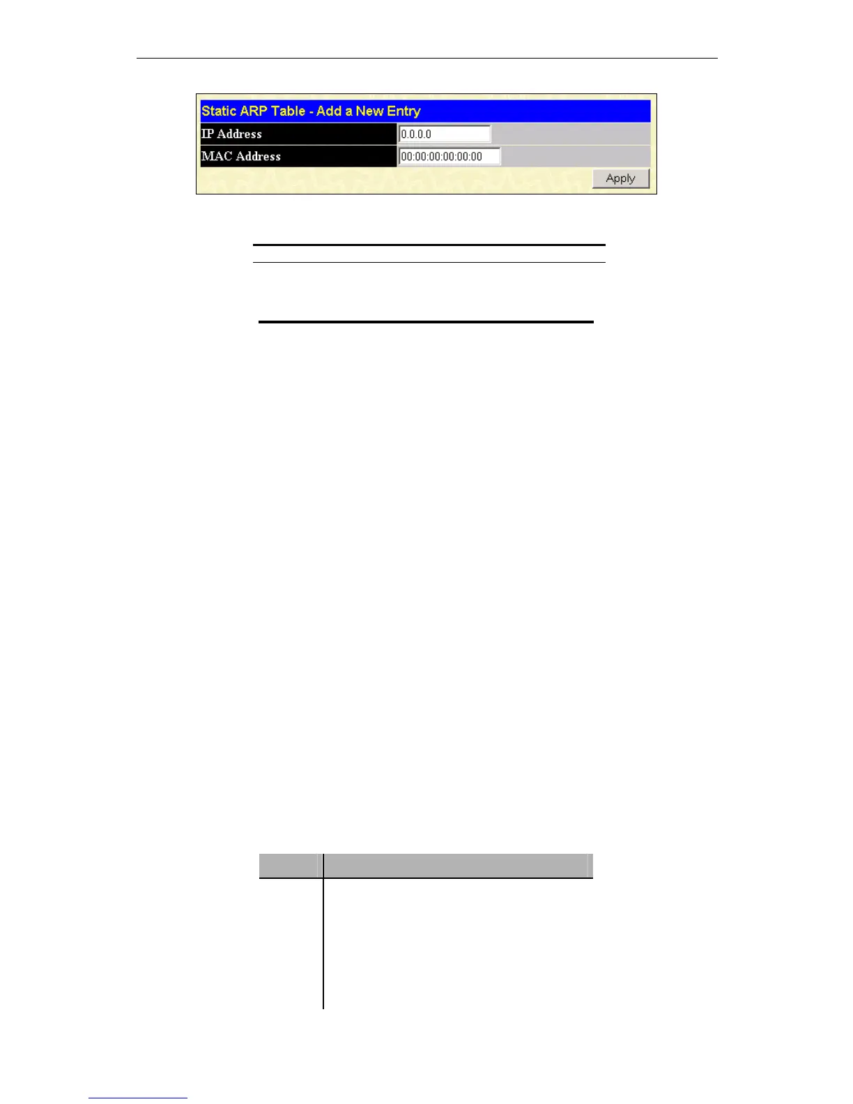 After entering the IP Address and MAC Address of the Static ARP entry, click Apply to implement the new entry.