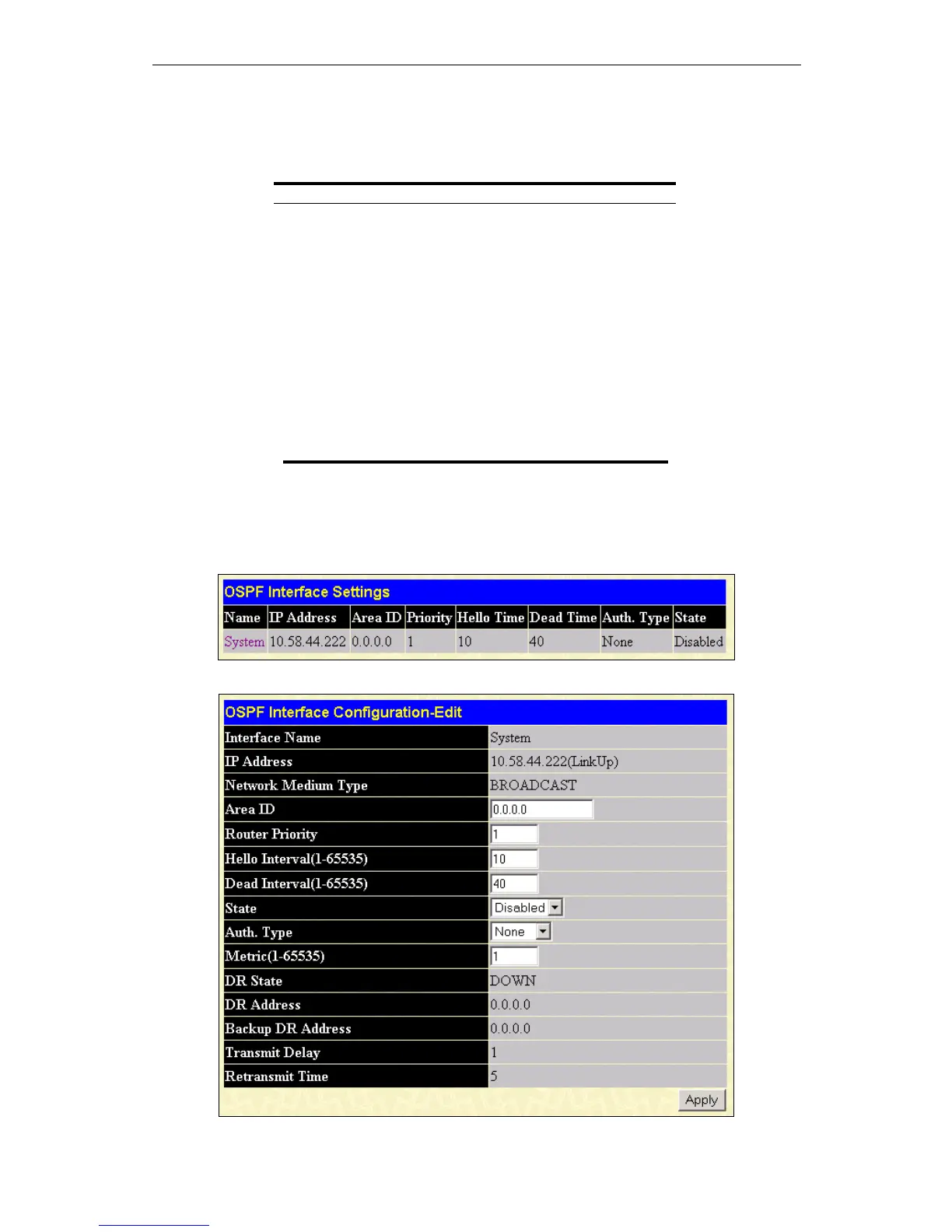 To set up OSPF interfaces, click Configuration > Layer 3 IP Networking > OSPF > OSPF Interface Settings to view OSPF