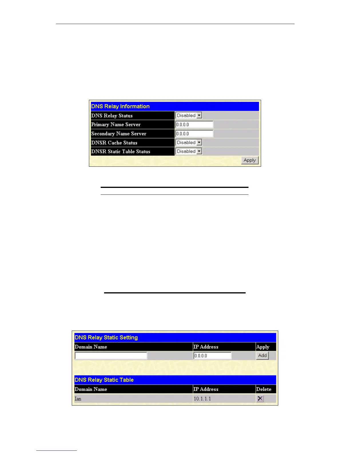 To view the DNS Relay Static Settings, click Configuration > Layer 3 IP Networking > DNS Relay > DNS Relay Static Settings,