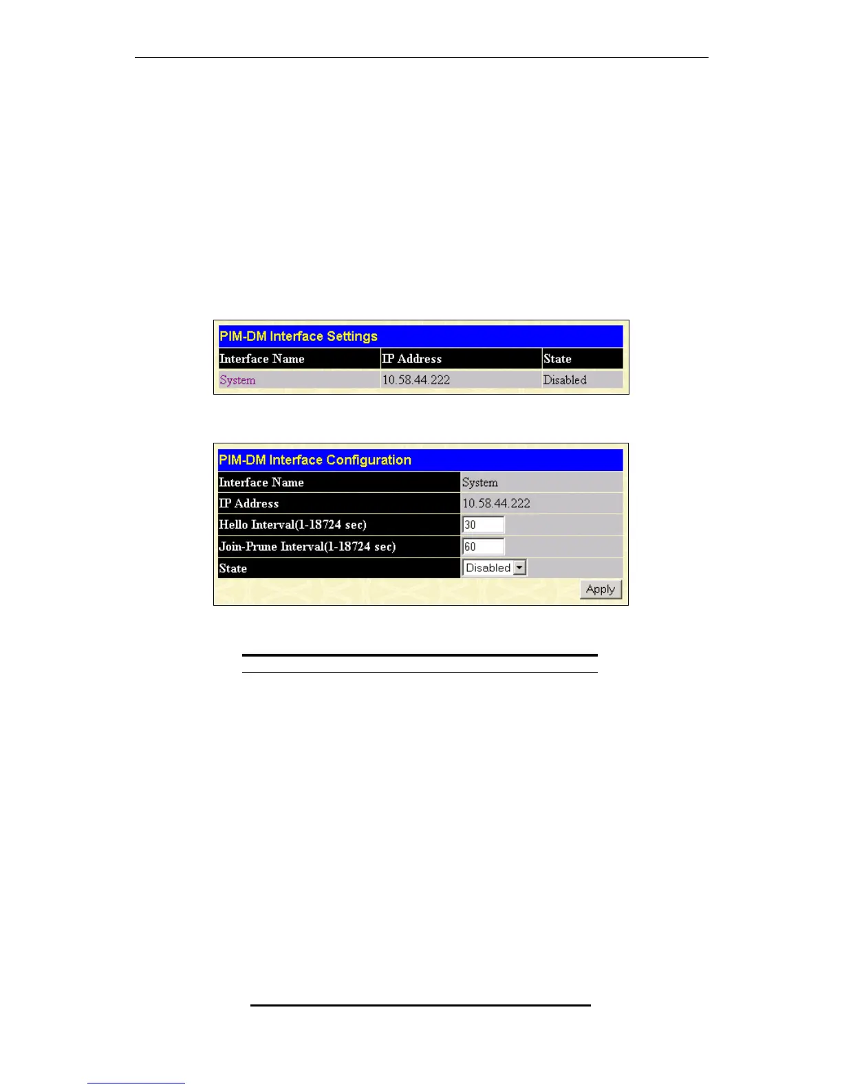 window allows the PIM-DM to be configured for each IP interface defined on the Switch. Each IP interface configured on the