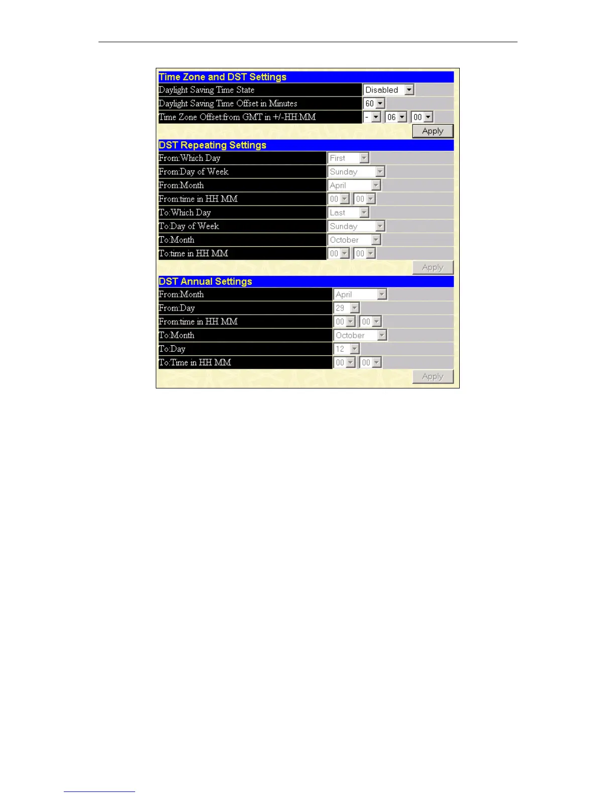 This window allows you to set the Daily Saving Time repeated and annual settings. Click Apply to let your changes take effect.