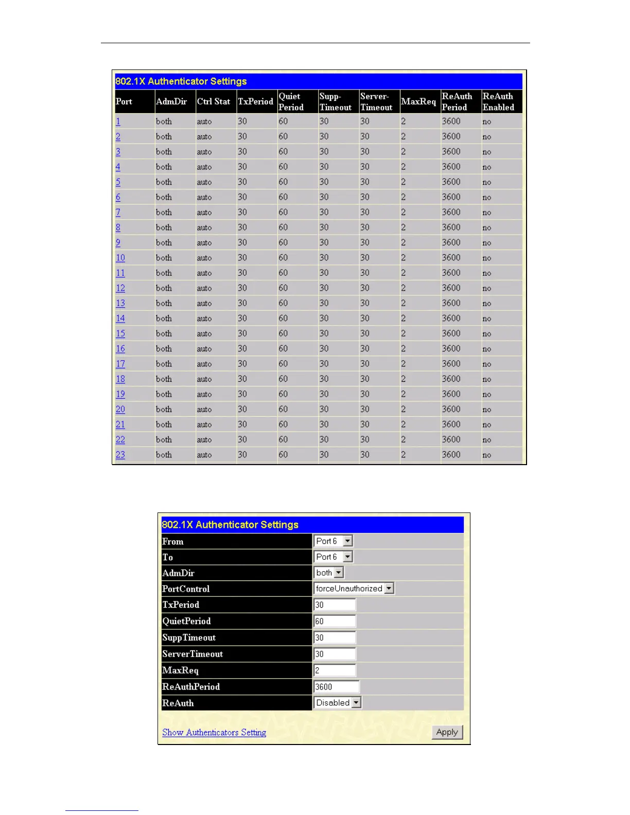 Click the selection button on the far left that corresponds to the port you want to configure. Use the Authenticator Settings
