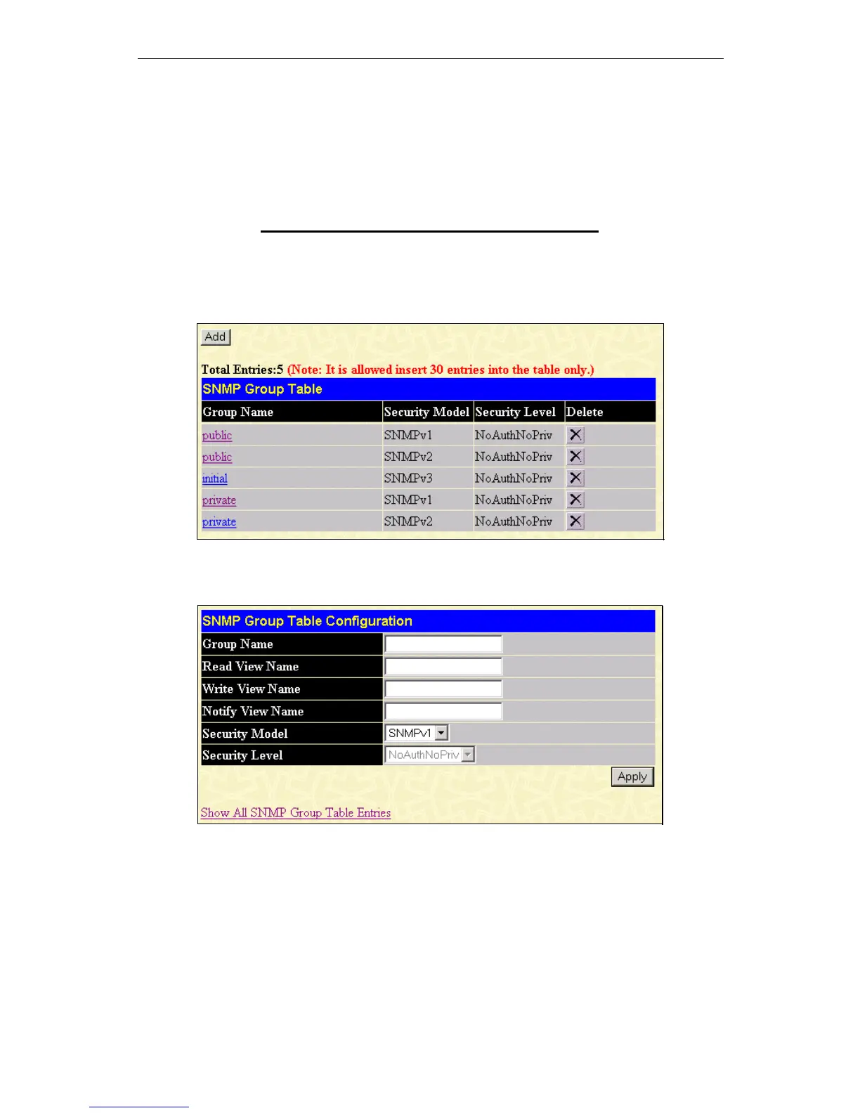 To display the current SNMP Group Table Configuration, click the Group Name in the first column of the SNMP Group Table