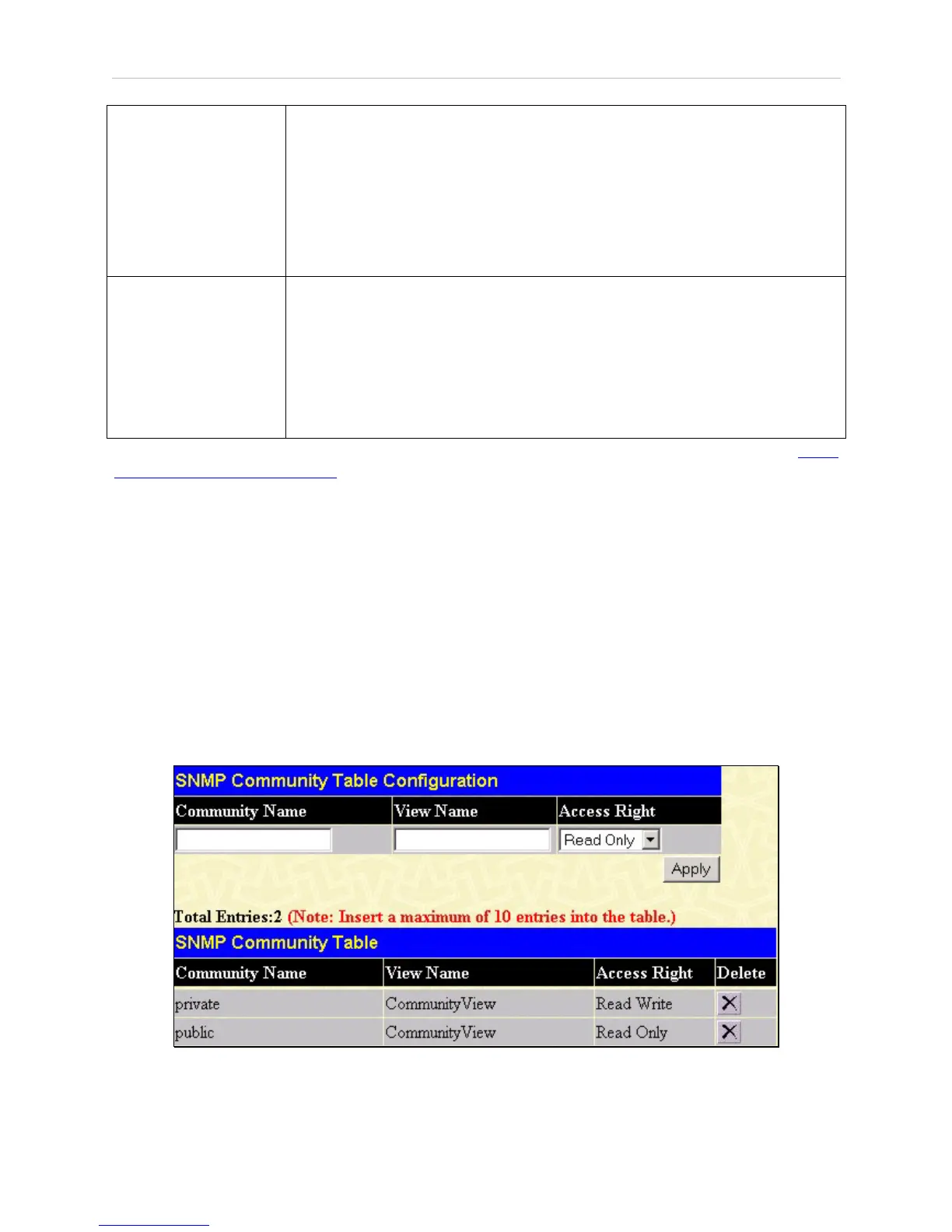 Management folder, and clicks the SNMP Community Table link, which will open the following