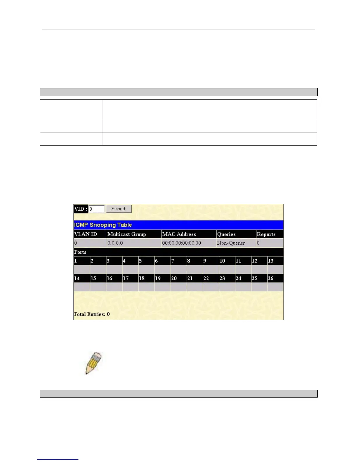 The user may search the IGMP Snooping Table by VLAN ID (VID) by entering the VID in the top