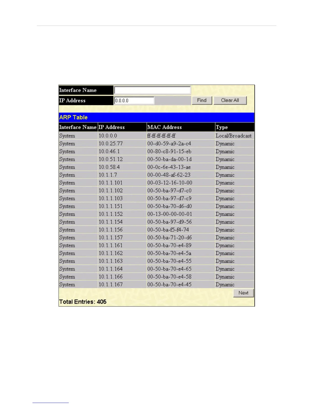 current ARP entries on the Switch. To search a specific ARP entry, enter an interface name into the Interface Name or an