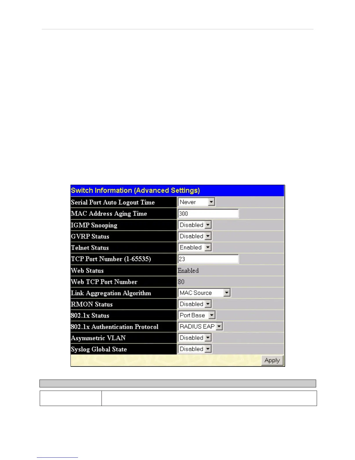 functions for the Switch. To view the Advanced Settings window, click its link in the Configuration