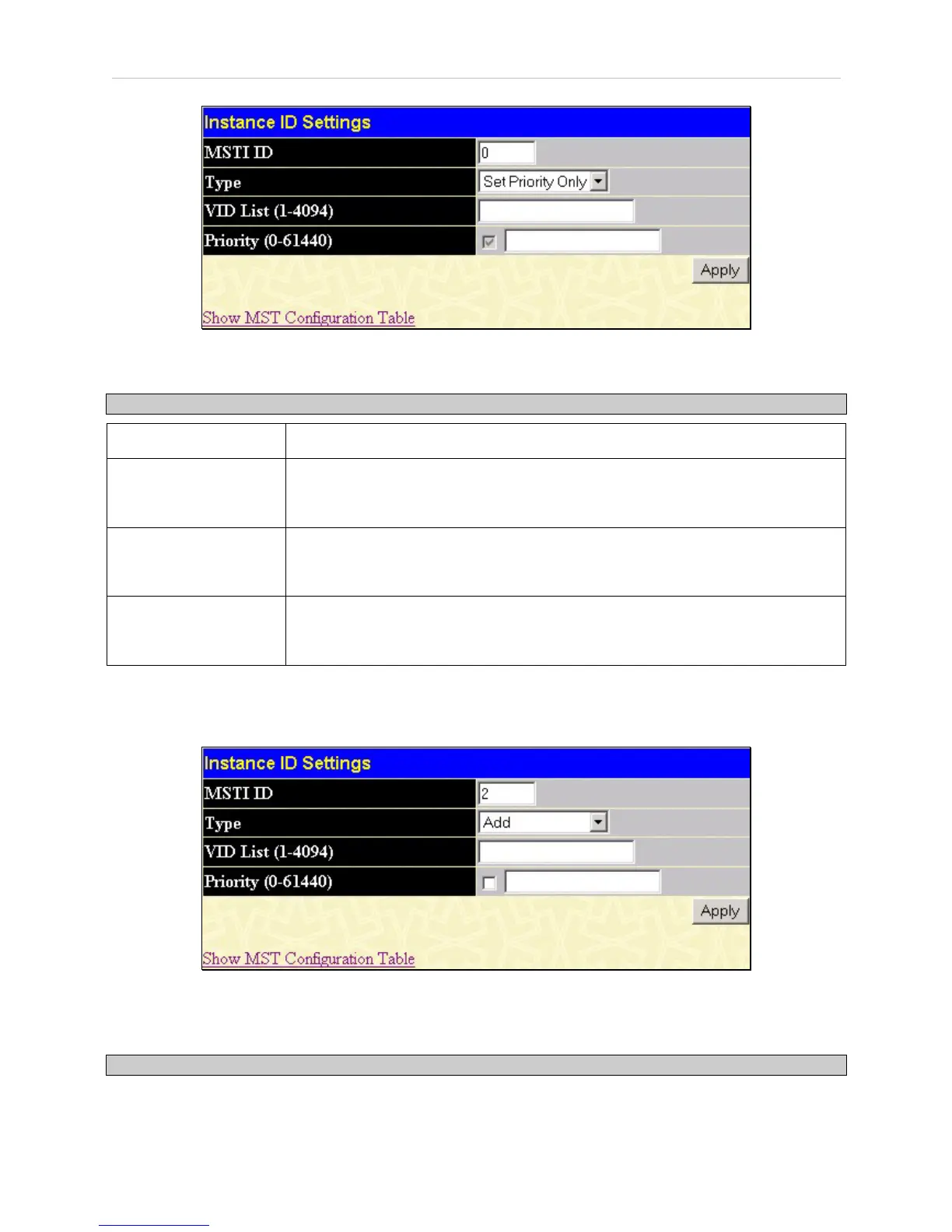 To configure the parameters for a previously set MSTI, click on its hyperlinked MSTI ID number,