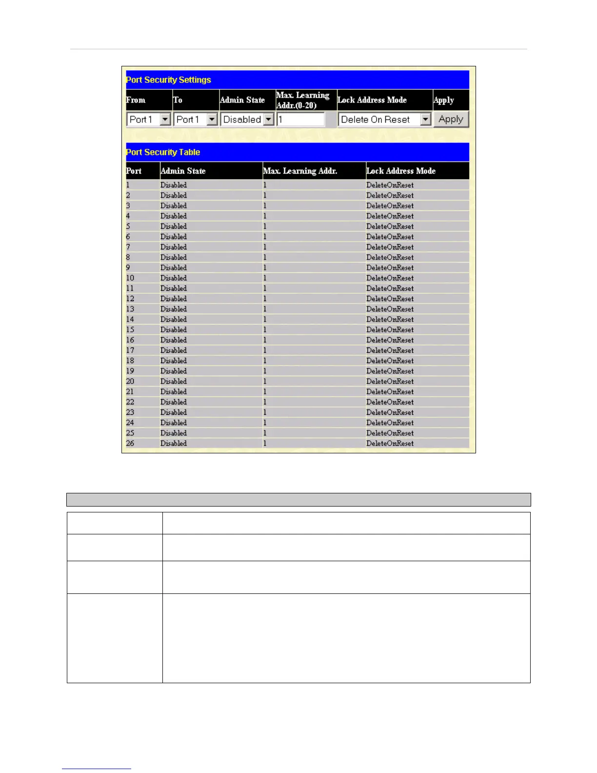 This pull-down menu allows you to enable or disable Port Security (locked MAC address