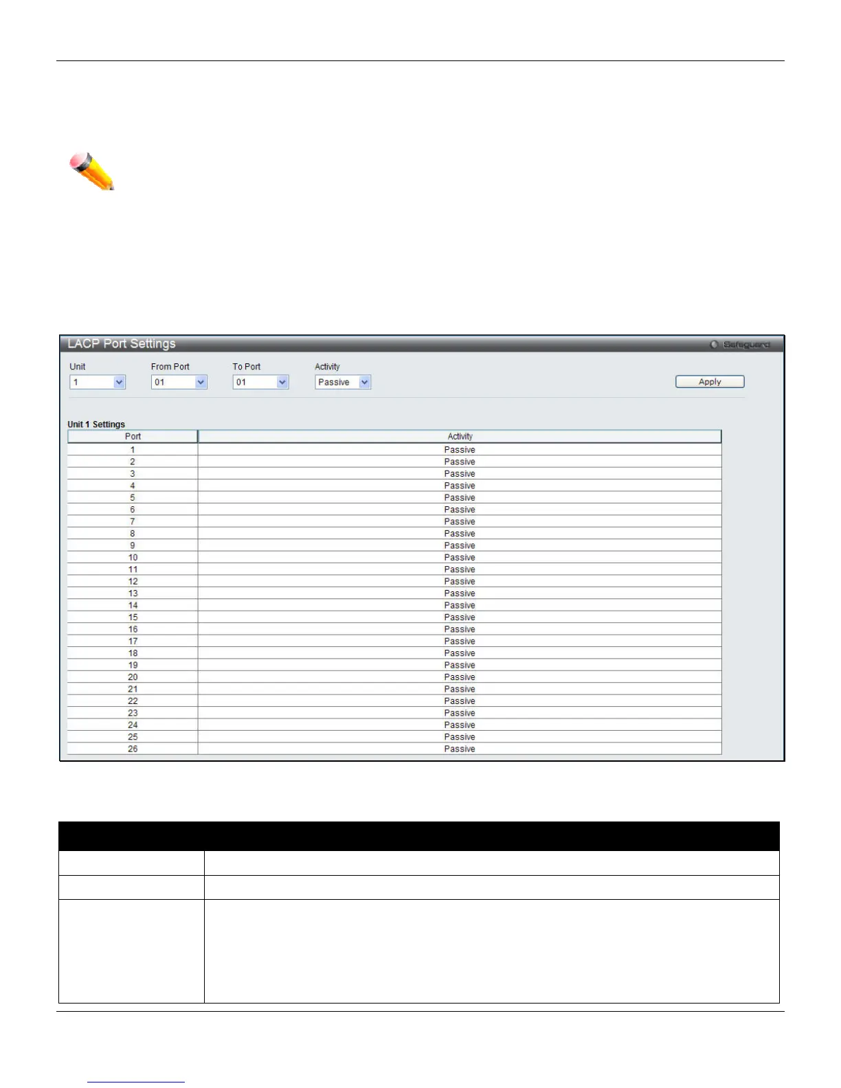 window, the user may set which ports will be active and passive in processing and sending LACP control frames.