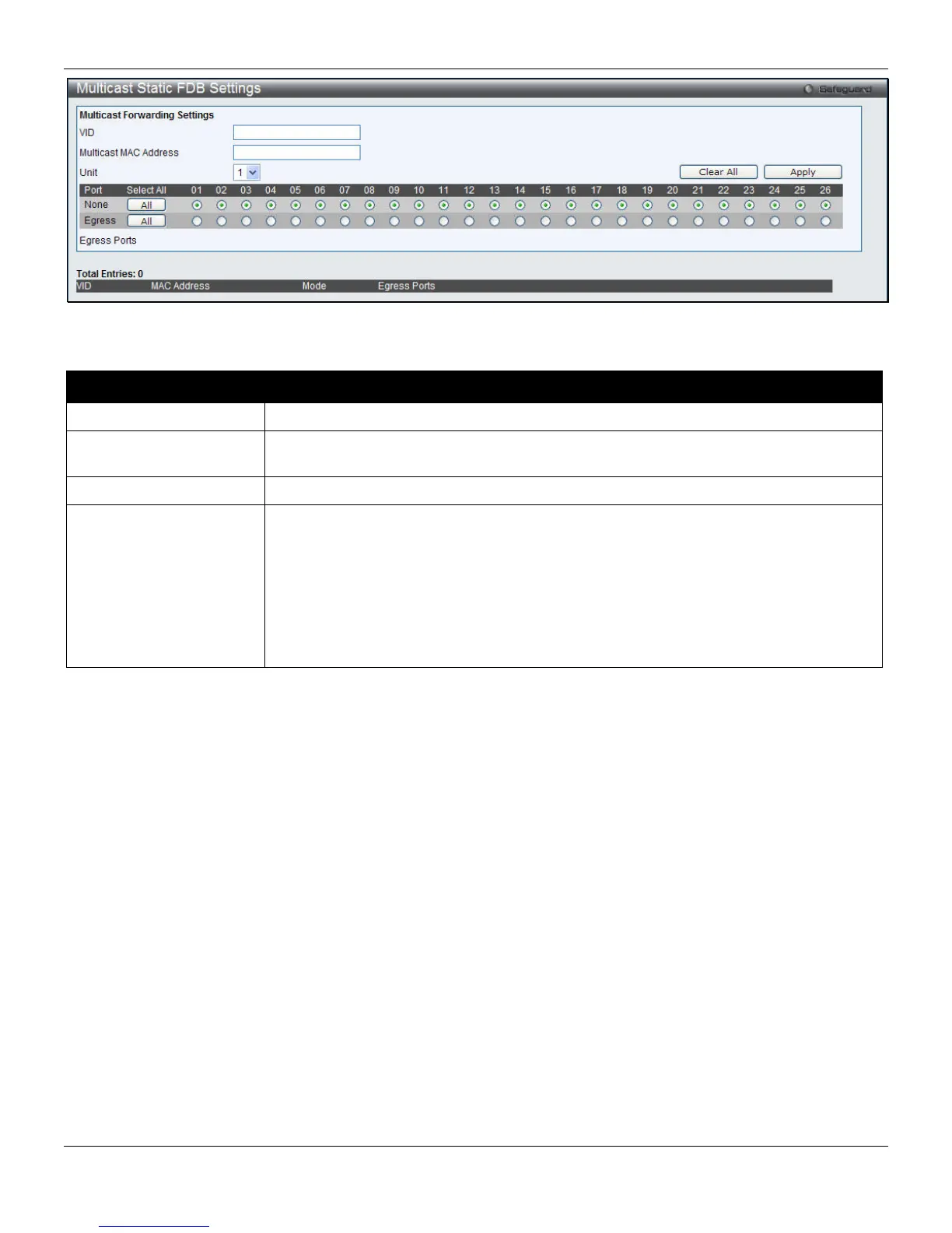 is chosen, the port will not be a member of the Static Multicast Group. Click the All