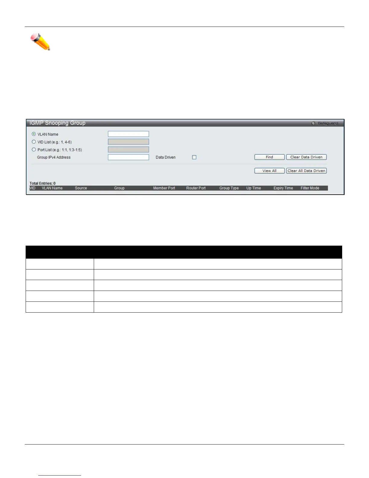 The user may search the IGMP Snooping Group Table by either VLAN Name or VID List by entering it in the top left