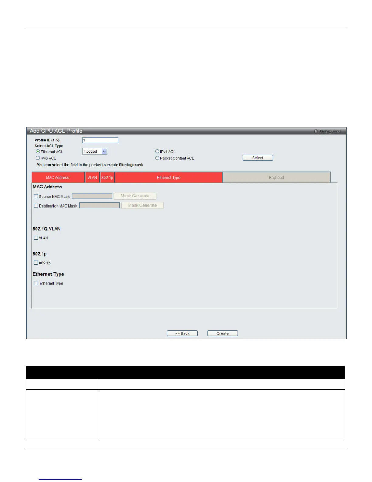 The window shown below is the Add CPU ACL Profile window for Ethernet. To use specific filtering masks in this ACL
