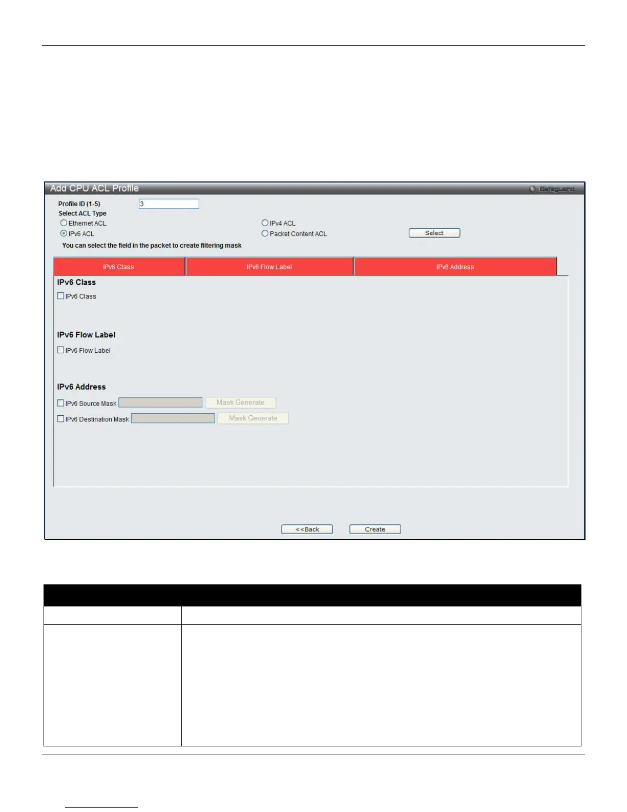 The window shown below is the Add CPU ACL Profile window for IPv6. To use specific filtering masks in this ACL