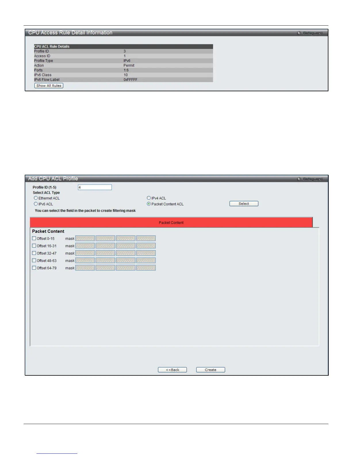 The window shown below is the Add CPU ACL Profile window for Packet Content. To use specific filtering masks in