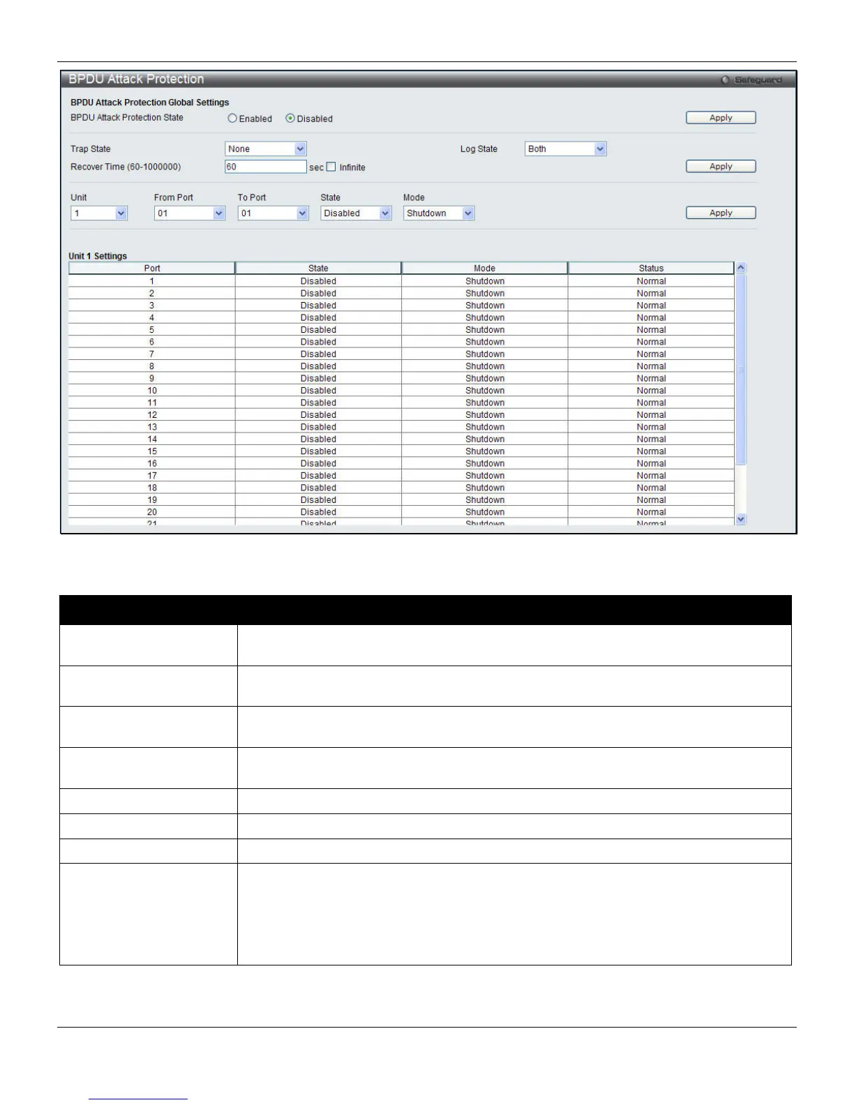 Click the radio buttons to enable or disable the BPDU attack protection state.