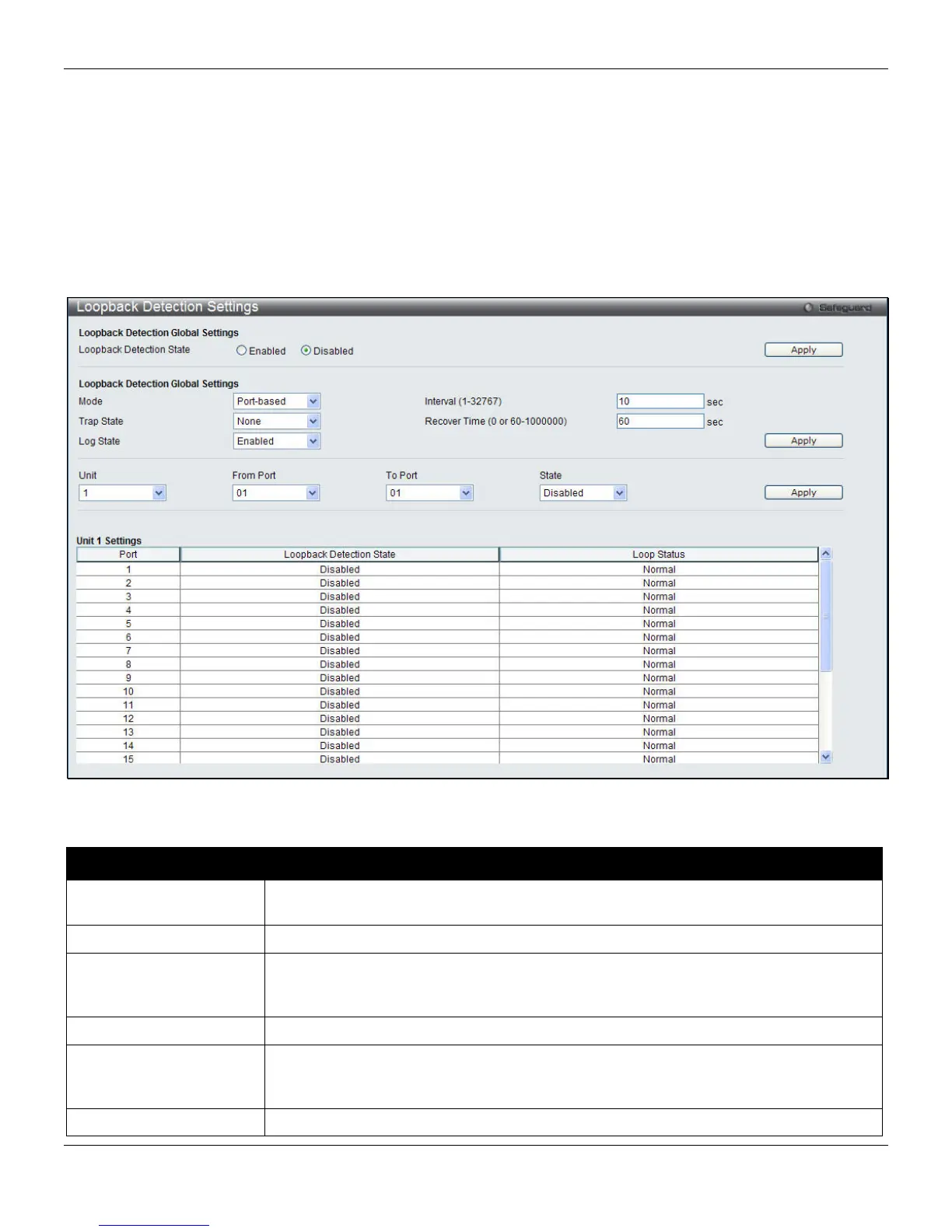 Use the radio button to enable or disable loopback detection. The default is Disabled.