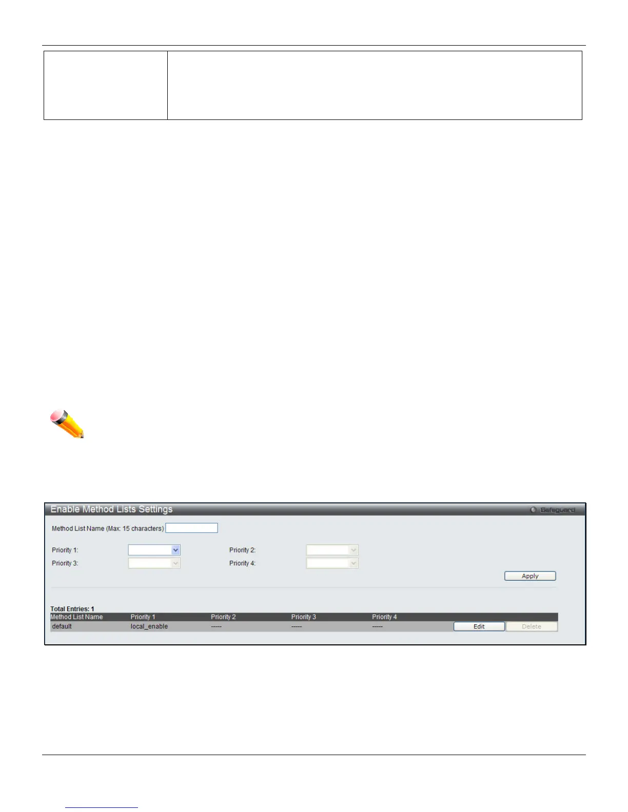 by the Administrator. A maximum of eight Enable Method Lists can be implemented on the Switch, one of which is a