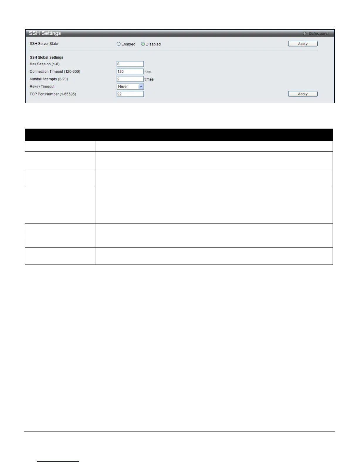 Use the radio buttons to enable or disable SSH on the Switch. The default is Disabled.