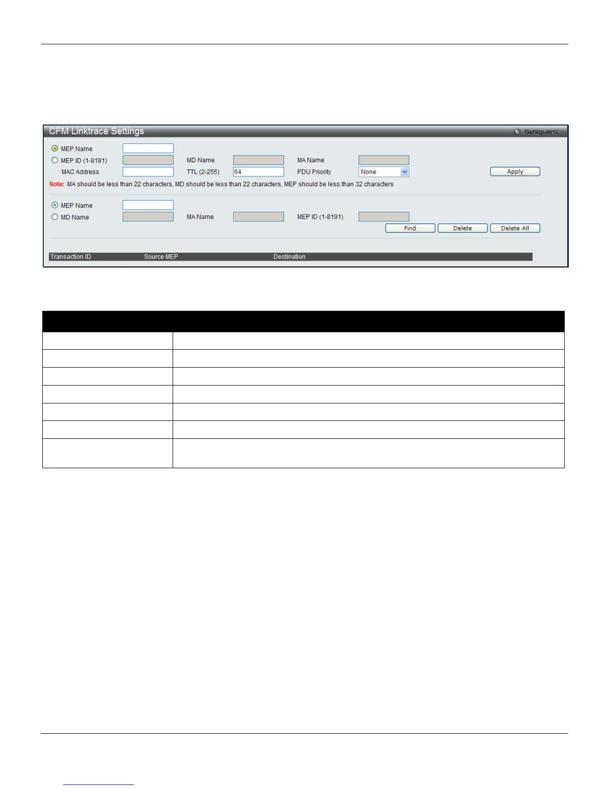 This window is used to configure the CFM linktrace settings on the Switch.