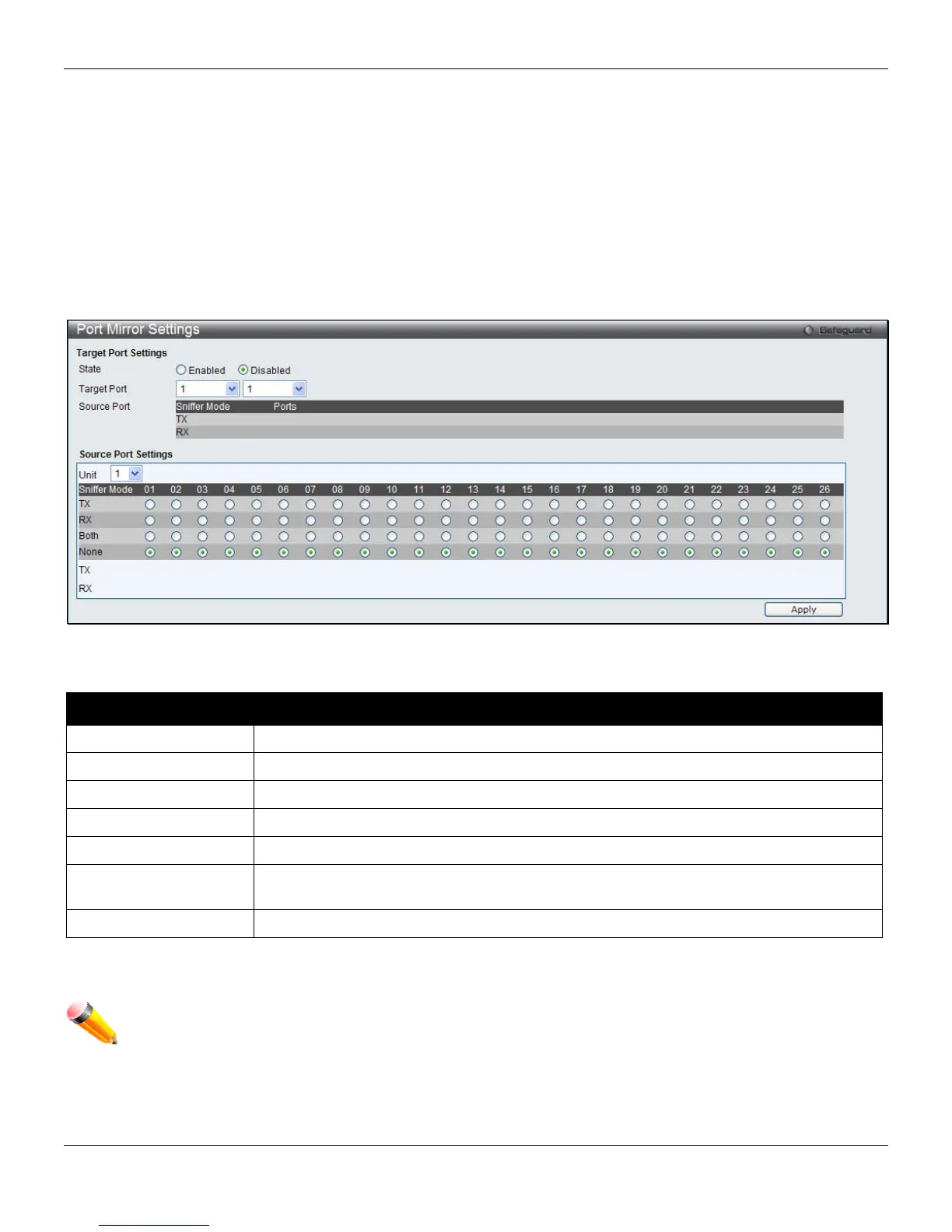 Click the radio buttons to enable or disable the Port Mirroring feature.