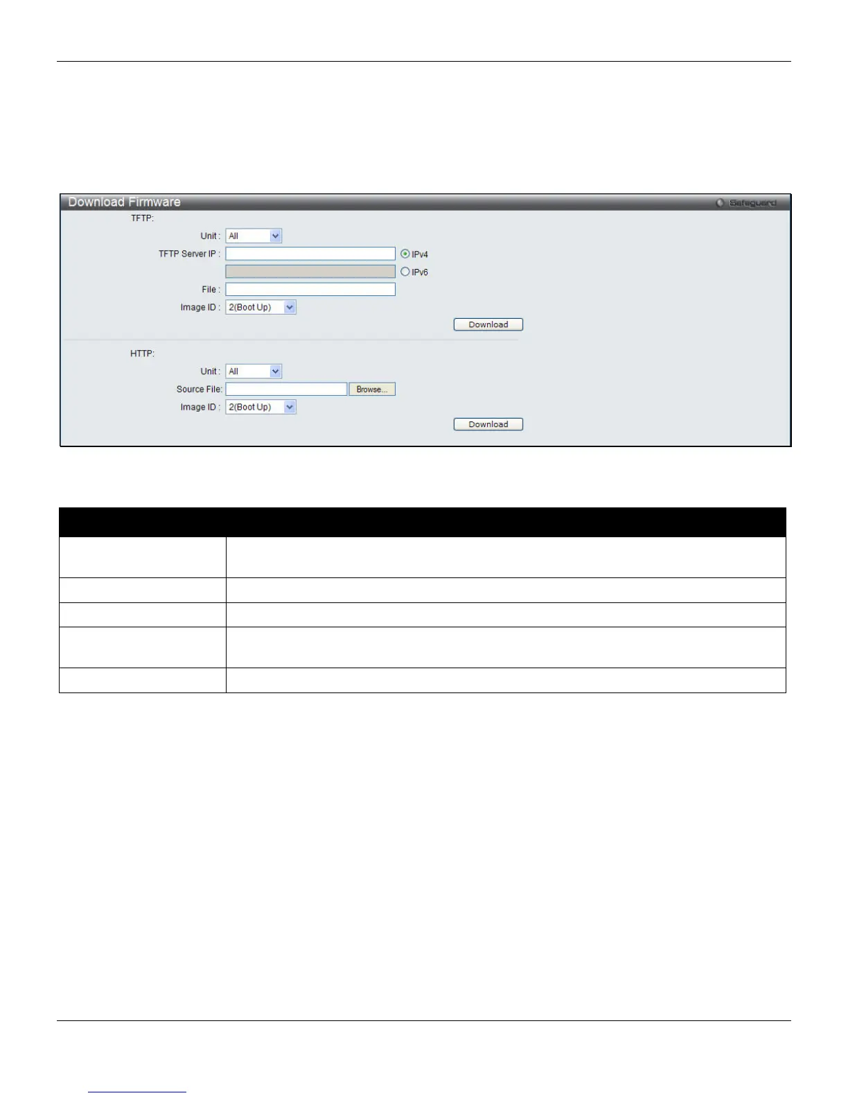 This window allows the user to download firmware from a TFTP Server to the Switch and updates the switch.