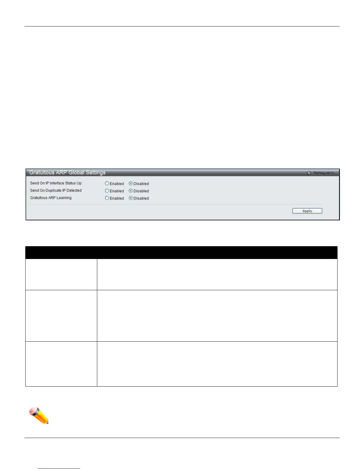 The user can enable or disable the gratuitous ARP global settings here. To view the following window, click