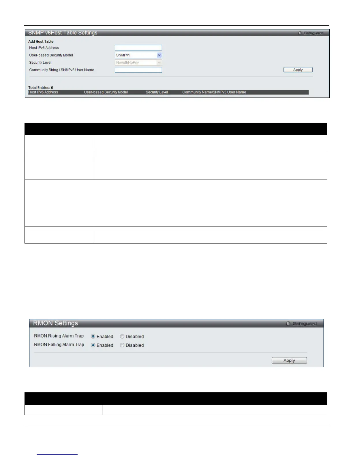 On this page the user can enable or disable remote monitoring (RMON) for the rising and falling alarm trap feature for