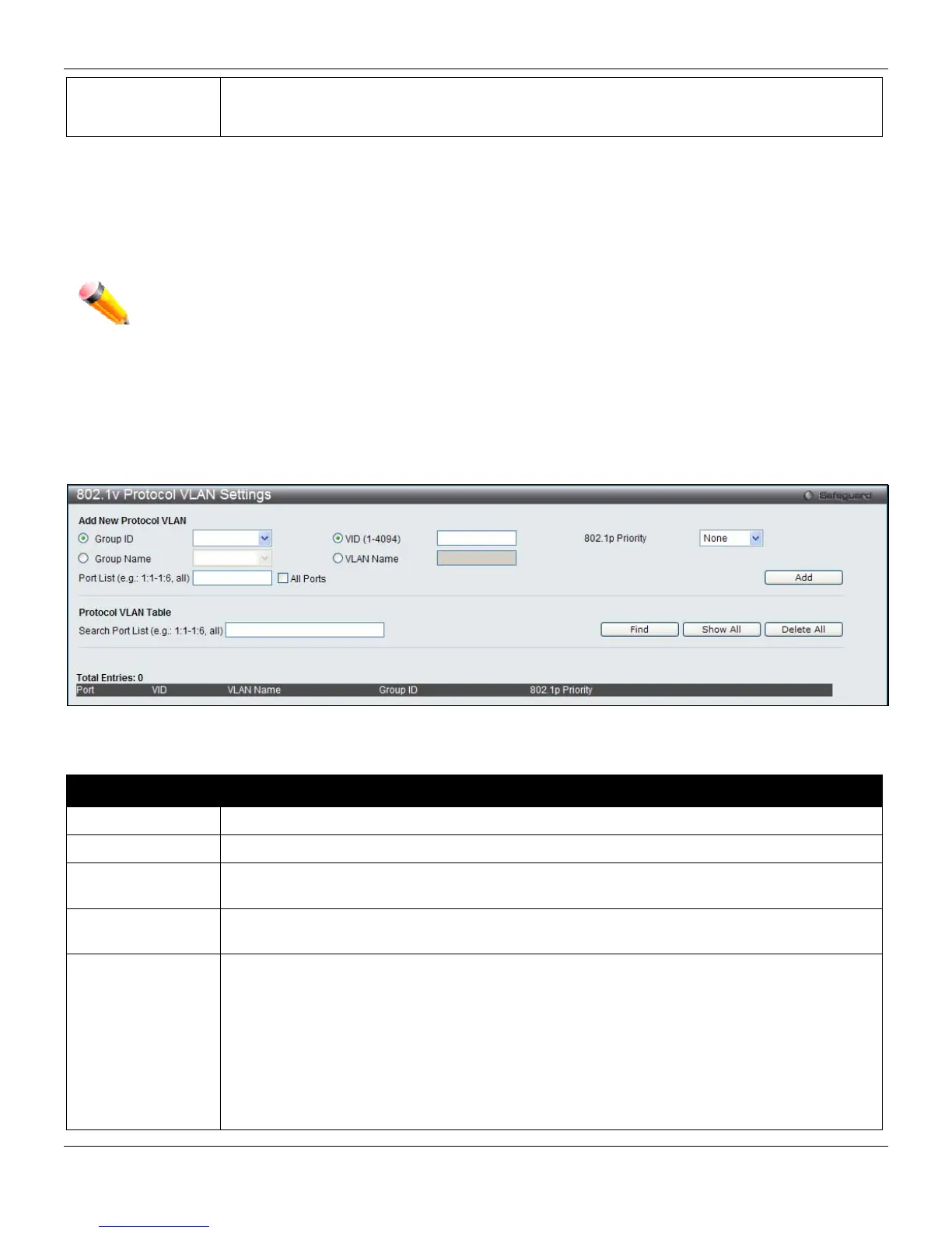 The user can configure Protocol VLAN settings. The lower half of the table displays any previously created settings.