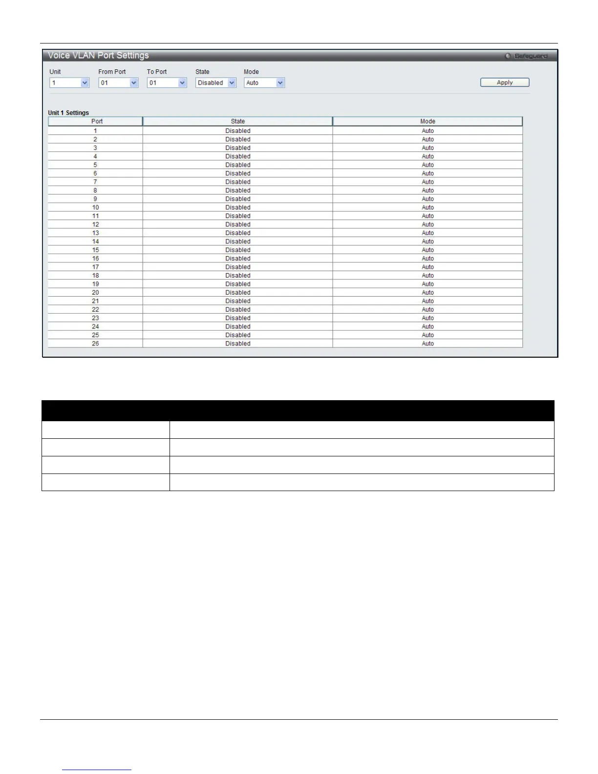 This page is used to configure the user-defined voice traffic’s OUI. The OUI is used to identify the voice traffic. There