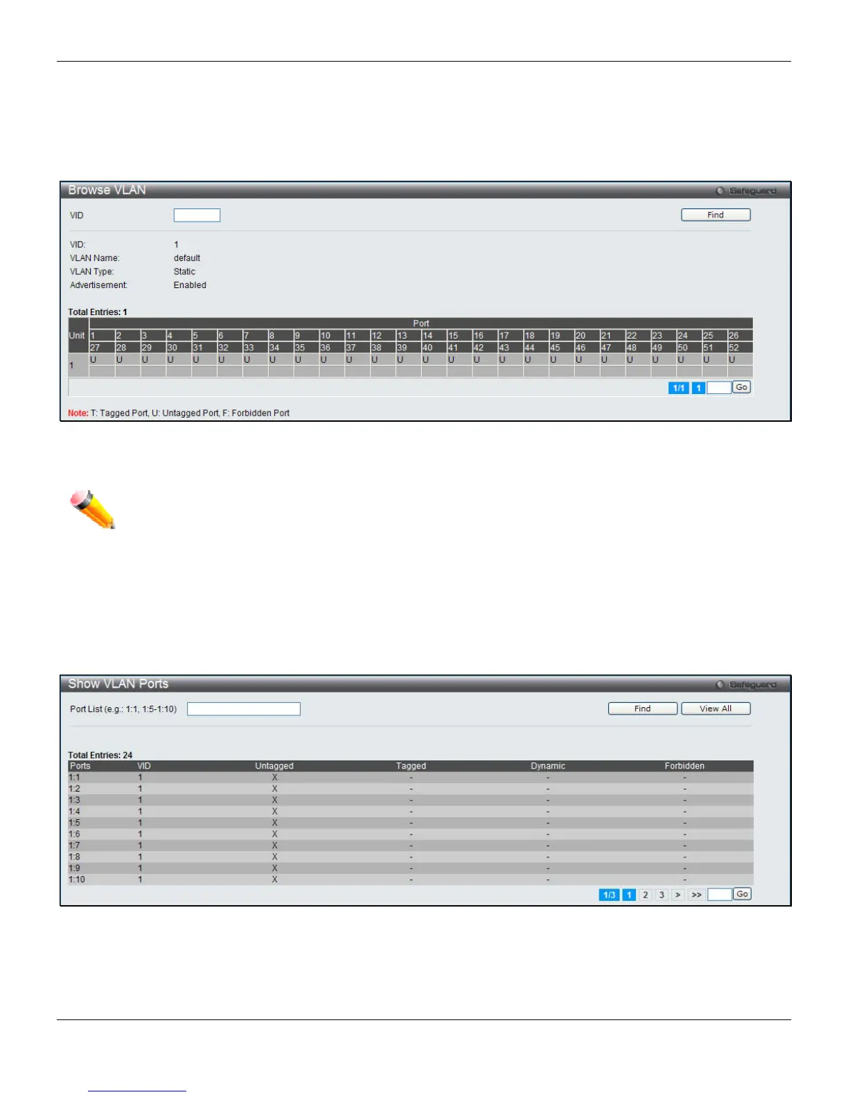 NOTE: The abbreviations used on this page are Tagged Port (T), Untagged Port (U) and Forbidden