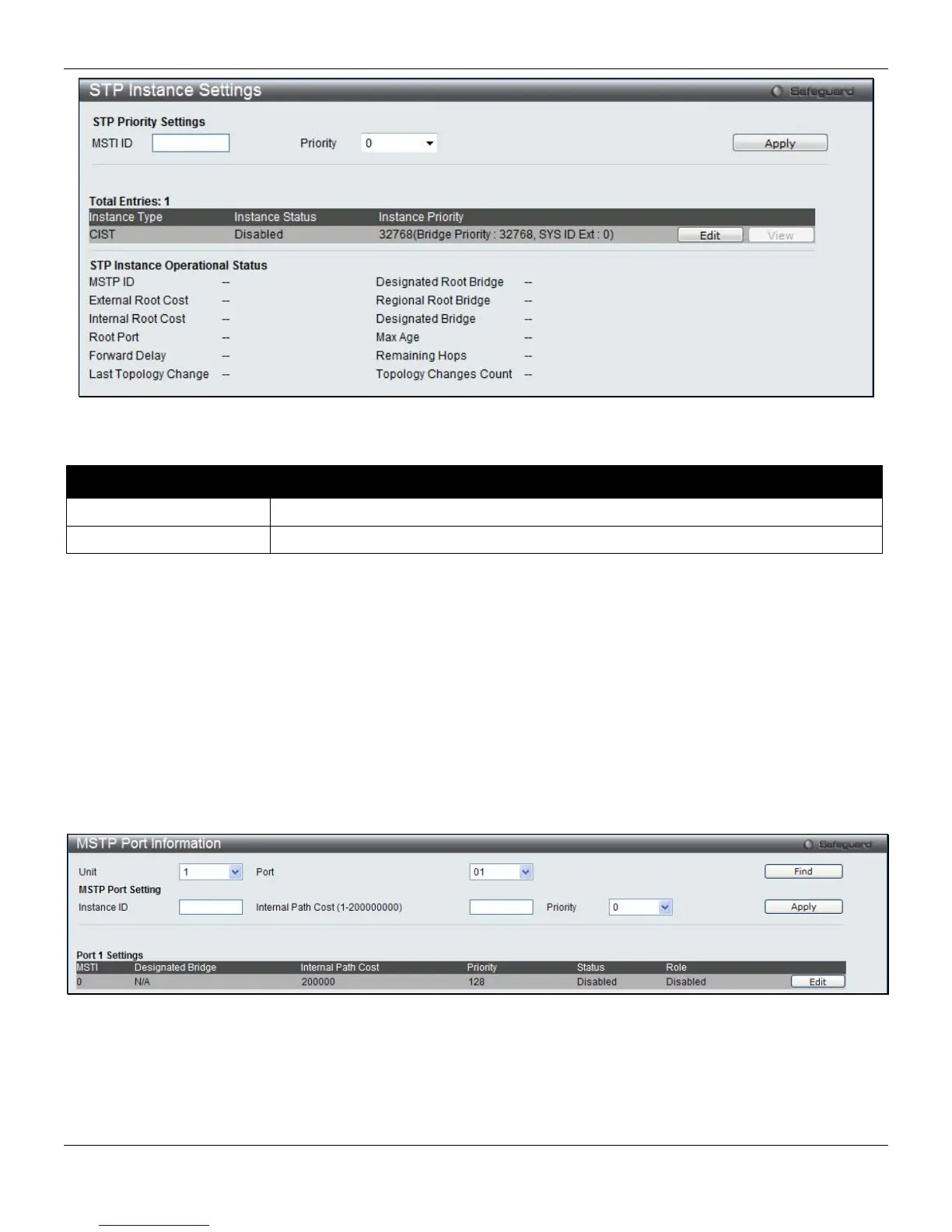To view the following window, click L2 Features > Spanning Tree > MSTP Port Information, as shown below: