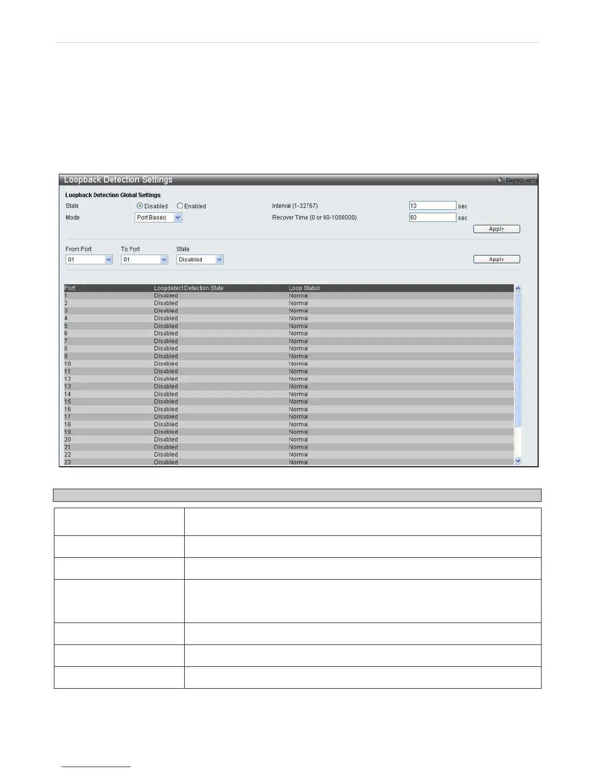 out. The Loopback Detection function can be implemented on a range of ports at a time. The user may enable or