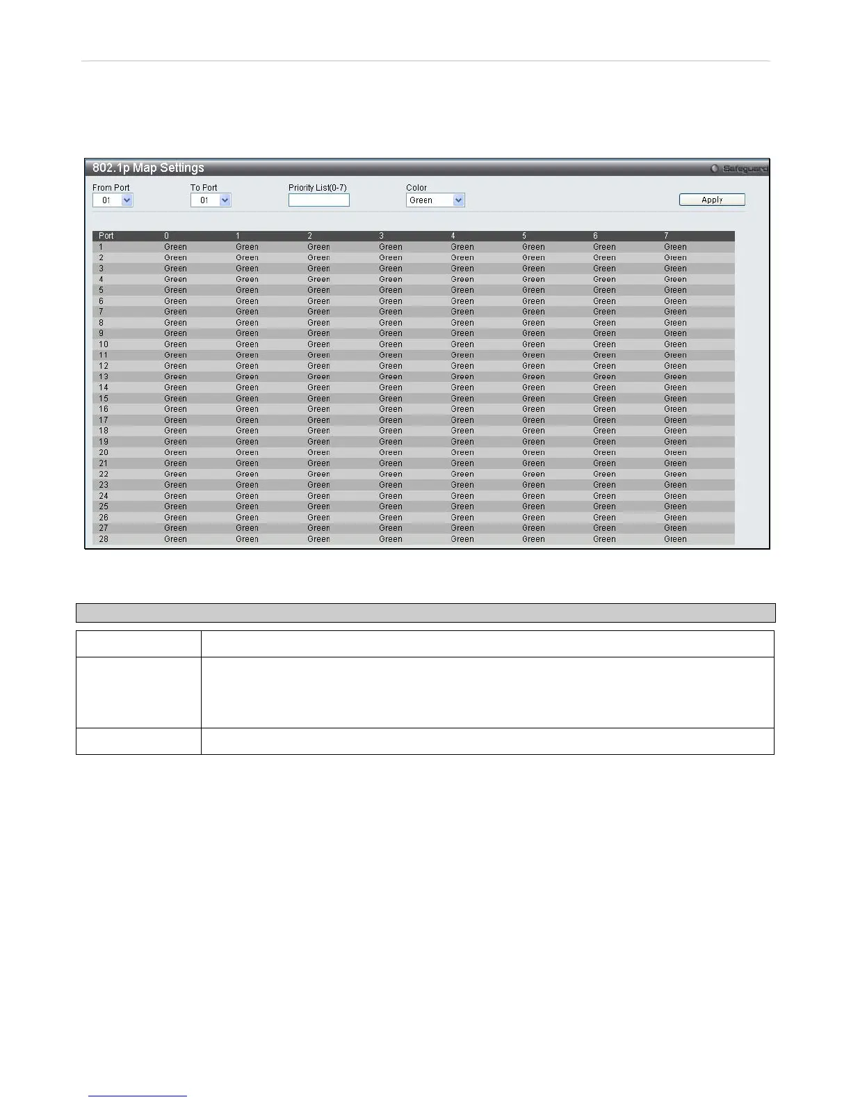 Priority List(0-7) This parameter is specified if you want to re-write the 802.1p default priority previously set in the
