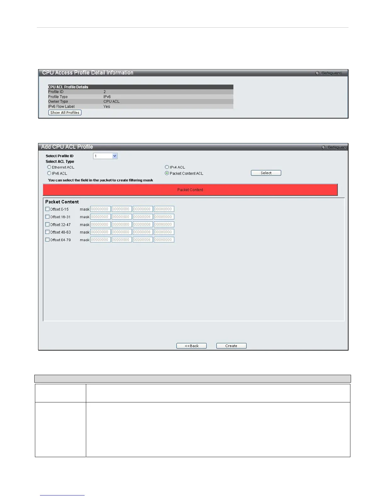 The window shown below is the Add CPU ACL Profile window for Packet Content.