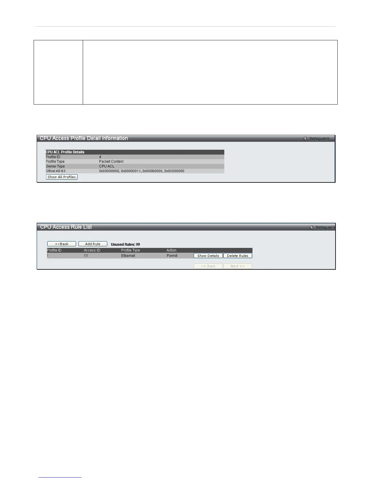 To configure the Access Rules for Ethernet, open the CPU Access Profile List window and click Add/View Rules for
